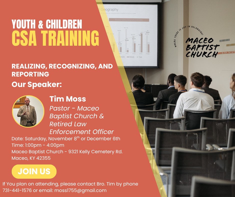Maceo Baptist Church will have a free youth and children CSA training on 11/08 and 12/06.